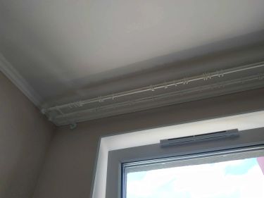 Разметим место для монтажа, соберём карниз, установим на потолок и закрепим. Работа займёт 30–40 мин. Будет шумно. Высота стен не более 3 м. Стремянку при необходимости предоставляет клиент.