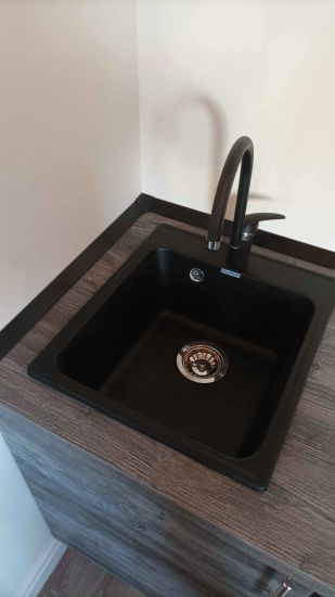 Соберём каркасы, навесим шкафы, дверцы и фурнитуру. Всё отрегулируем. Установим, мойку с сифоном и смесителем.